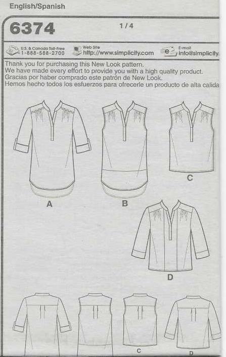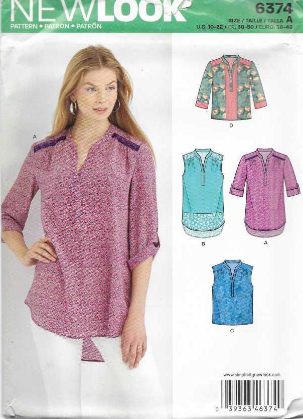 Misses' top pattern includes half sleeve top with shirt tail hem, sleeveless top with contrast yoke and band, sleeveless top with contrast yoke, and 3/4 sleeve top with contrast yoke, center front and sleeve band.
