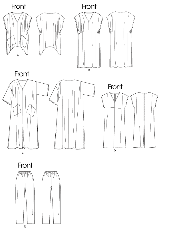 A, B, C, D: Very loose-fitting V-neck top or dress. A, B, C: Pullover. A, C: Patch pockets. C: Slits at hem. Jumpsuit D: Side seam pockets. E: Loose-fitting, pull-on pants with tapered leg and elastic waistband.