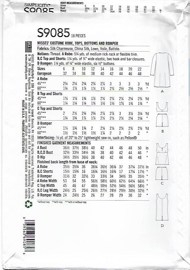 Misses' Robe, Top, Bottom and Romper/Playsuit Sewing Pattern you can create lingerie tops with darts and a back hook and eye closure, shorts with an elasticated waist, button-front rompers and robes without closure and with a trim at the edges.