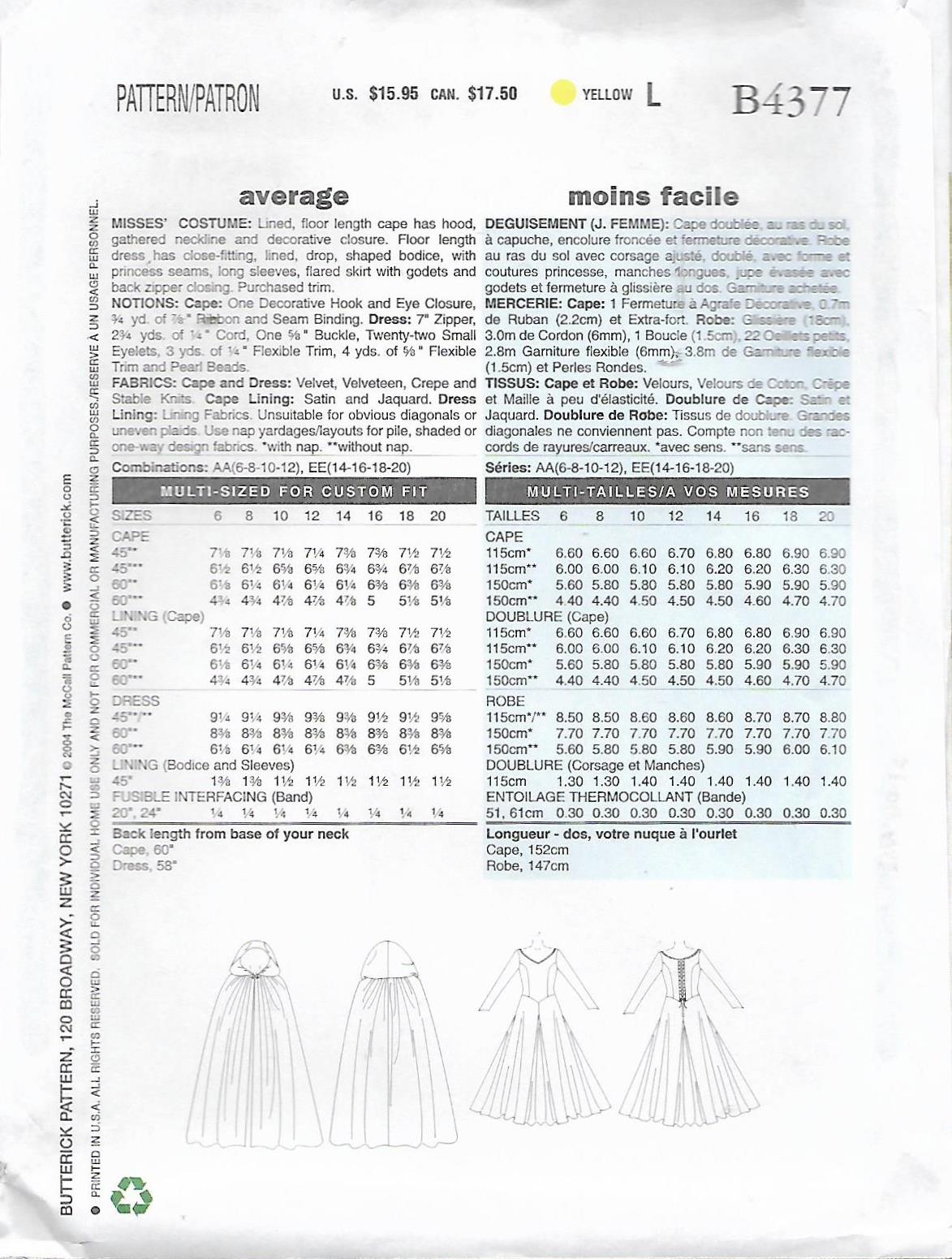 Lined, floor-length cape has hood, gathered neckline and decorative closure. Floor-length dress has close-fitting, lined, drop-waist, shaped bodice, with princess seams, long sleeves, flared skirt with godets and back zipper closing. Purchased trim.