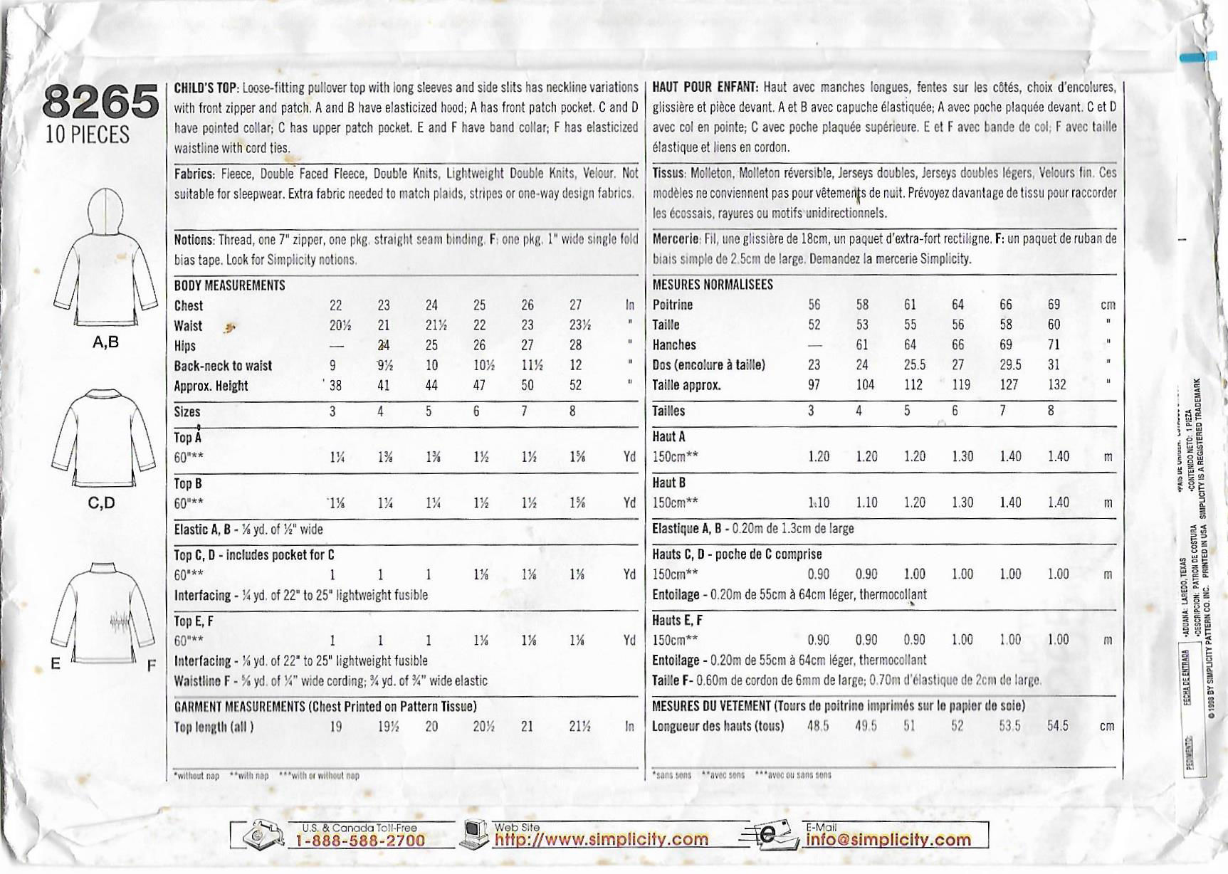 A102 SIMPLICITY 8265: CHILD'S JACKET SIZE 3-6