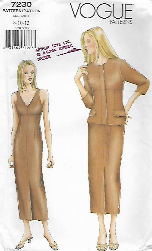 semi-fitted partially interfaced, lined, above hip jacket has shoulder pads, seam detail, welt pockets, flaps, concealed frount zipper closing amd below elbow sleeves. close-fitting, lined, straight, sleeveless dress, lower calf, has front hemline vent and side zipper.