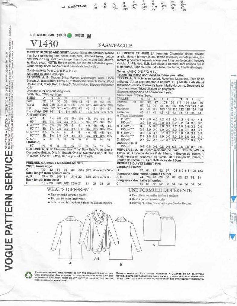 FABRICS: A,B: Drapey Silks, Rayons, Lightweight Wools or Linen Blends. Also for A: Border Prints. C: Moderate Stretch Knits: Wool Double Knit, Ponte Knit. Lining C: Tricot Nylon, or Slippery Polyester Knit.