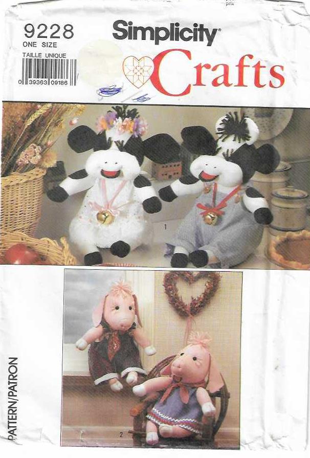 This packet contains the patterns and instructions for a 13-inch cow doll, 13-1/2-inch pig doll and girl and boy clothes.