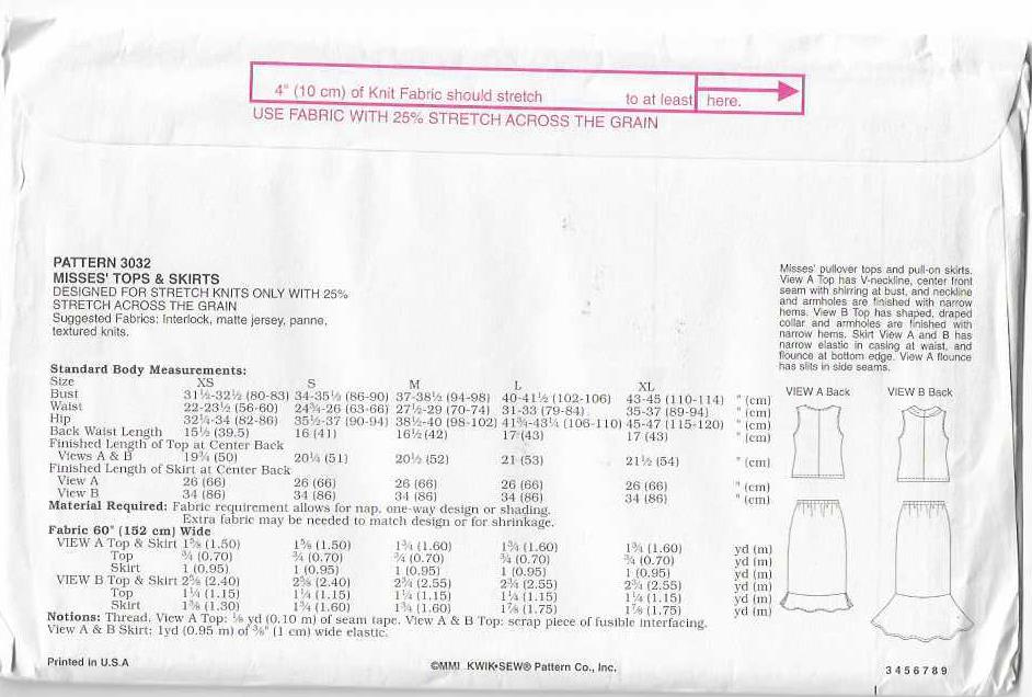 The Misses' Tops & Skirts are designed for stretch knits only with 25% stretch across the grain. We suggest interlock, matte jersey, panne or textured knits.