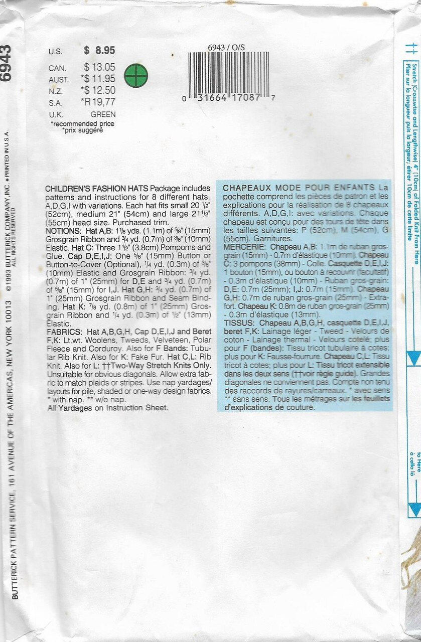 C353 BUTTERICK 6943: CHILDREN'S FASHION HATS SIZE S-L