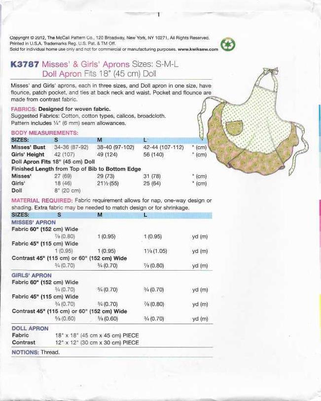 Misses' and Girls' aprons, each in three sizes, and Doll apron in one size, have flounce, patch pocket, and ties at back neck and waist. Pocket and flounce are made from contrast fabric.