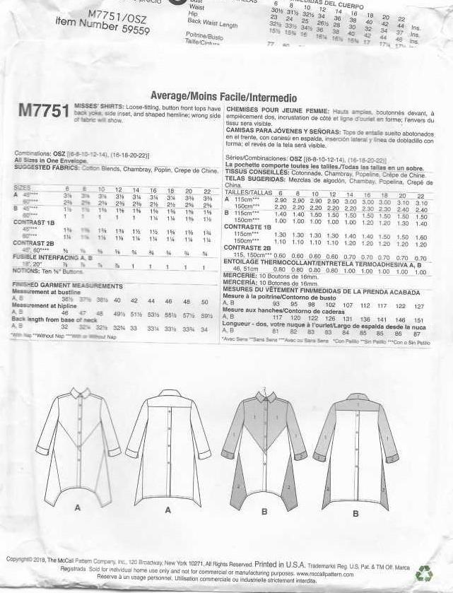 Loose fitting button front tops have back yoke, side inset and shaped hemline; wrong side of fabric will show.