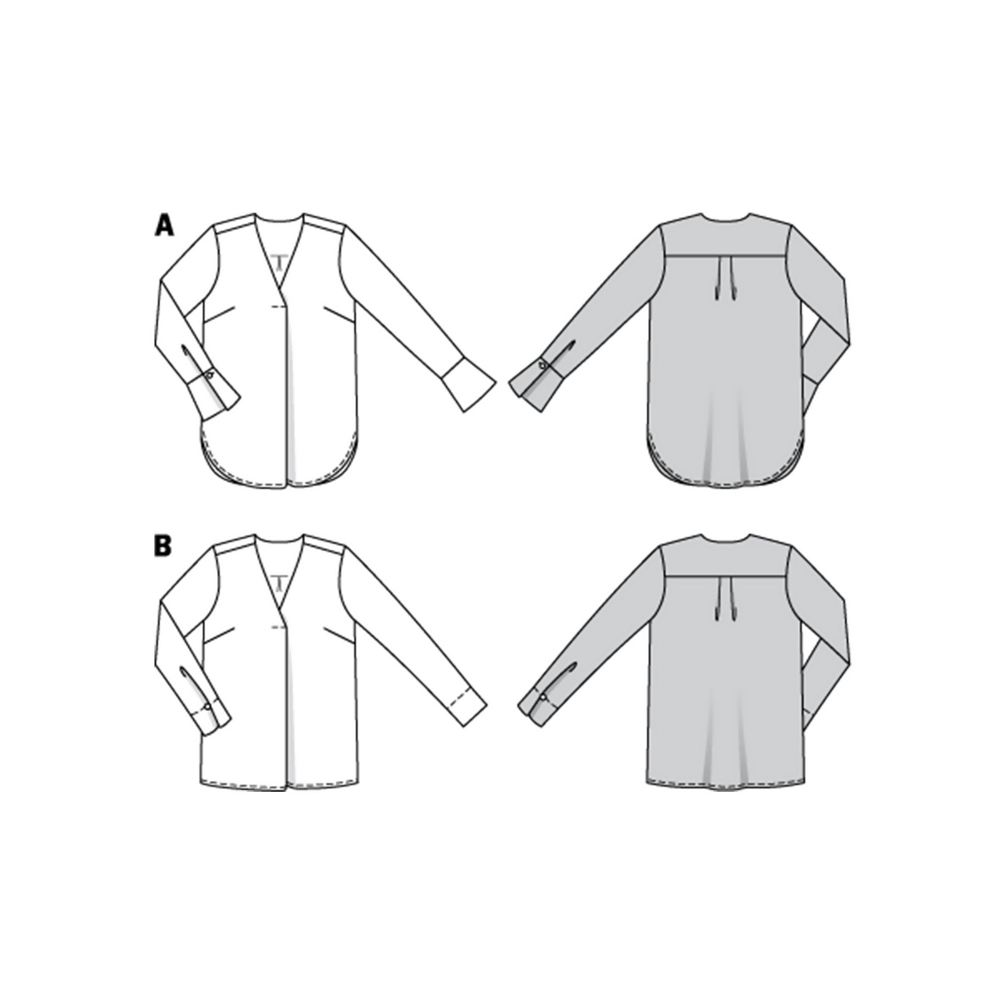 The latest blouses are casually loose fitting and just the right length to pair with pants. Details are the shoulder yoke, small pleats in back and long sleeves. The eye-catching V-neckline and a single pleat at the side are finishing touches. Choose between a straight hem or rounded edges. Pull-On in Two Lengths