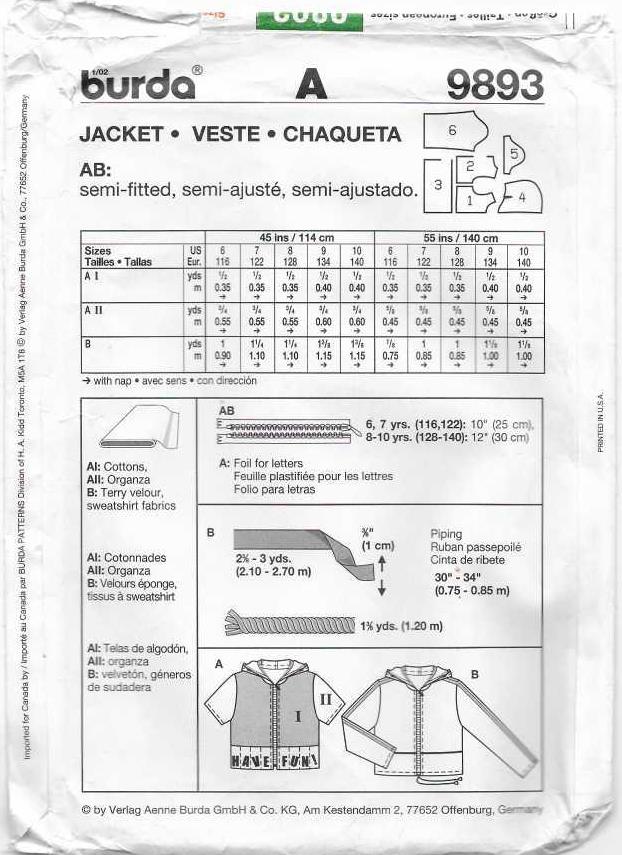 Child's semi-fitted, hooded jacket. View A jacket has contrasting sleeves, hood and bottom section and a front zipper; View B jacket has long sleeves with contrasting trim around the waist. Centre front zipper and drawstring casing around base of jacket.