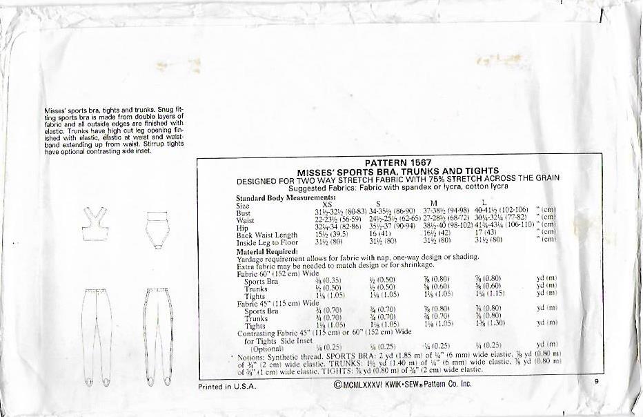 C315 KWIK*SEW 1567: SPORT BRA, TRUNKS & TIGHTS SIZE XS-XL