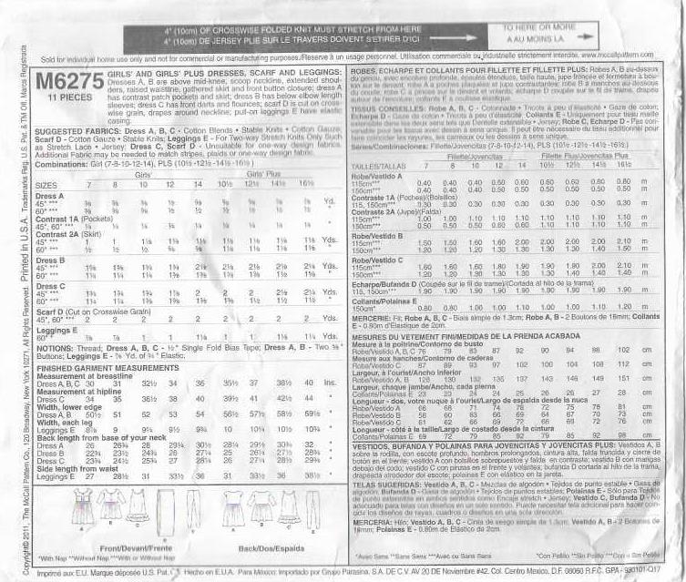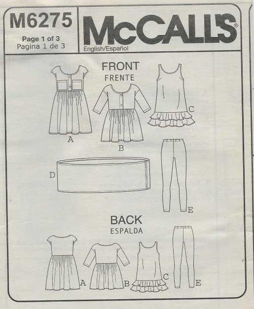 Dress A, B: Above mid-knee, scoop neckline, extended shoulders form cap sleeves, raised waistline, gathered skirt and front button closure. A: Contrast chest pockets and skirt. B: Below elbow-length sleeves. Dress C: Front darts and tiered ruffle flounces. Scarf D: Cut on crosswise grain, drapes around neckline. Leggings E: Pull-on with elastic casing.