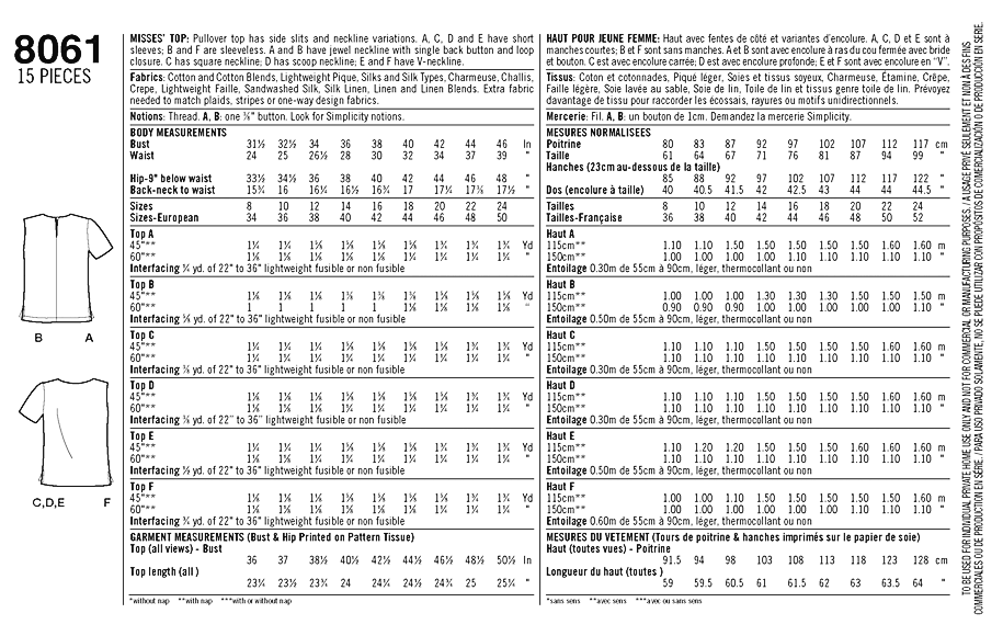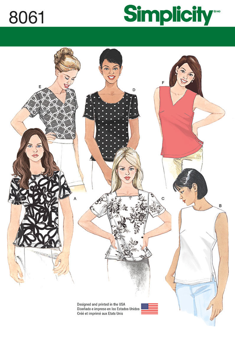 These essential tops are a must have staple for every wardrobe. Pattern includes short sleeves or sleeveless and necklines including scoop, crew, V-neck and square. Simplicity sewing pattern.