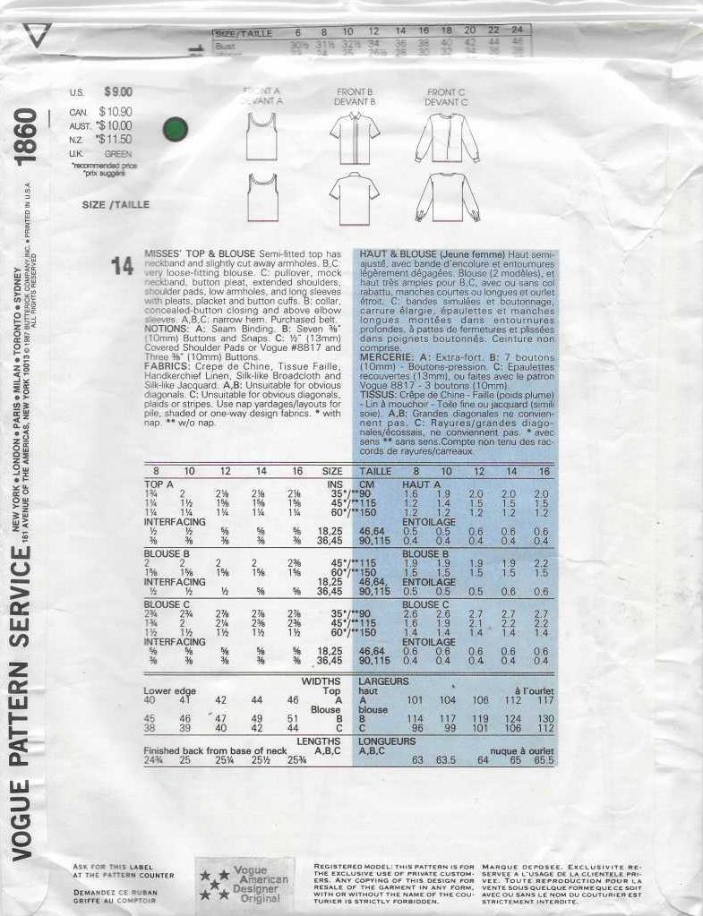 Vogue 1860American Designer Calvin KleinVintage 80s Uncut Sewing PatternMisses' long or short sleeve top & blouse, 3 variations.